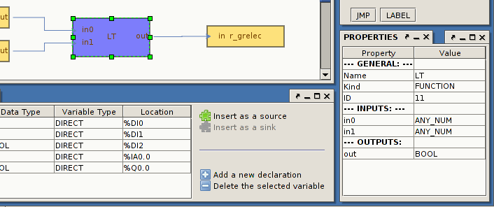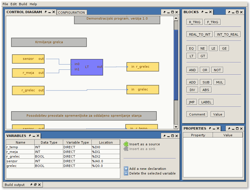 Programming is done in an IEC FBD-like fashion. However, there is only one single program (cyclically executed) and available functions and function blocks are hard-coded into the environment. Variables are either local, global or direct. And each direct variable has some location assigned to it. Supported data types are BOOL, REAL and INT. Special internal locations are data blocks. Data blocks are integer variables that can be accessed and/or modified from outside through a serial connection.